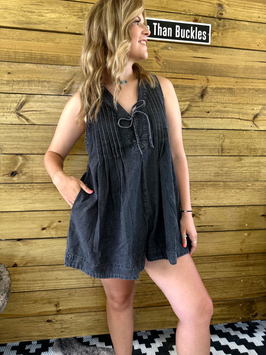 Black Denim Pleated Tie Romper
